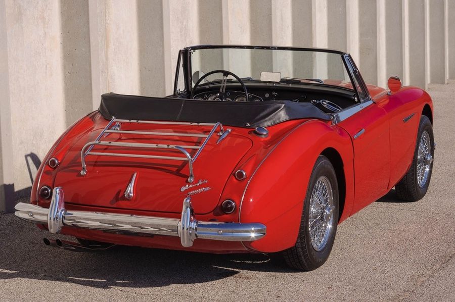 1963 Austin-Healey 3000 Mark II BJ7 2+2 Roadster. Older professional restoration that still shows beautifully today!. 1963 was the first year for curved windshields and roll-up side glass. One of only 6,113 BJ7 2+2s made in 1963. Left-hand drive. Signal Red exterior over black leather interior and black folding soft-top. 2.9L inline OHV six-cylinder engine with twin SU HS6 carburetors and 3.91 gearing. Four-speed manual transmission with optional overdrive. Aluminum radiator and stainless-steel exhausts. Newer battery and recent serviced. 60-spoke wire wheels and rear luggage rack Despite Chevrolet’s new Corvette in 1963. Dressed in Signal Red, the car’s paint and trim are all in overall excellent condition. The body is straight, the engine bay is extremely tidy and the cargo area is in very good order and include a spare tire and extra wire wheel. The chrome, wraparound bumpers look great and fit tightly to the body. The car has a new battery and was recently serviced. There’s a rear-mounted luggage rack for extra storage on those three-day weekend getaways or day trips. This roadster rolls on Nexen radials, size 165/80R15 at every corner and every tire is mounted to a 60-spoke wire wheel. The wheels are in excellent order while the tires are in very good condition. Under the hood is a 2.9L OHV six-cylinder engine with twin SU HS6 carburetors. The motor is linked to a four-speed manual transmission with overdrive for third and fourth gears and 3.91:1 rear end. There’s also an aluminum radiator to keep it running cool and stainless-steel exhausts for great sound and durability. The car has a newer battery and underwent a recent service. Inside, there are black leather seats with red piping that are in great shape. The complementing black carpet is in similar shape. A three-spoke steering wheel faces the driver while the inner door panels and instrument panel are in very good order. The floor-mounted shift lever has an oaken shift knob and completes the interior.