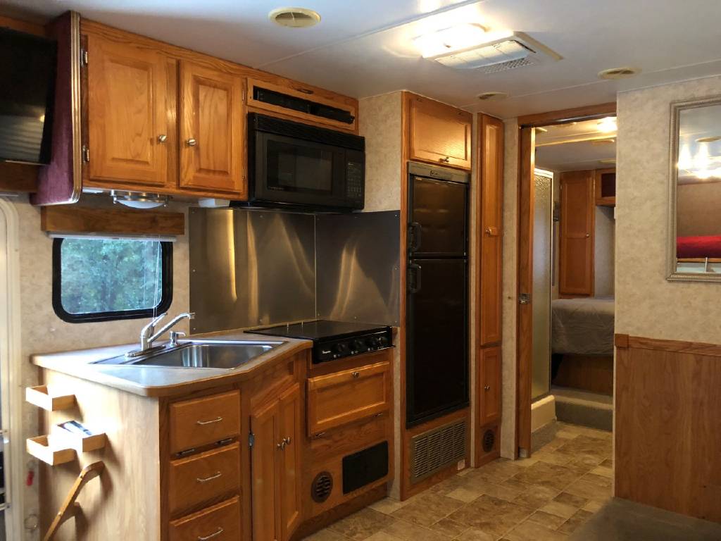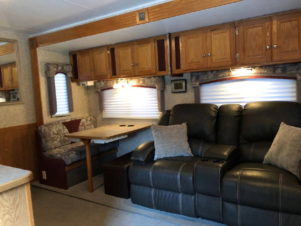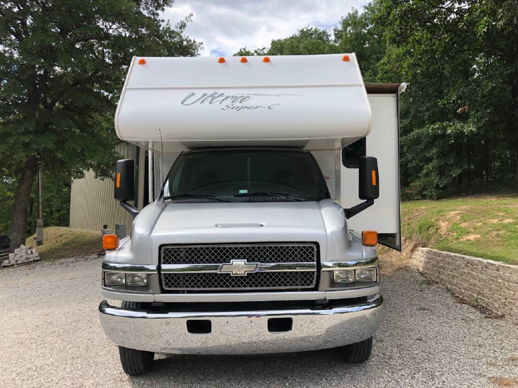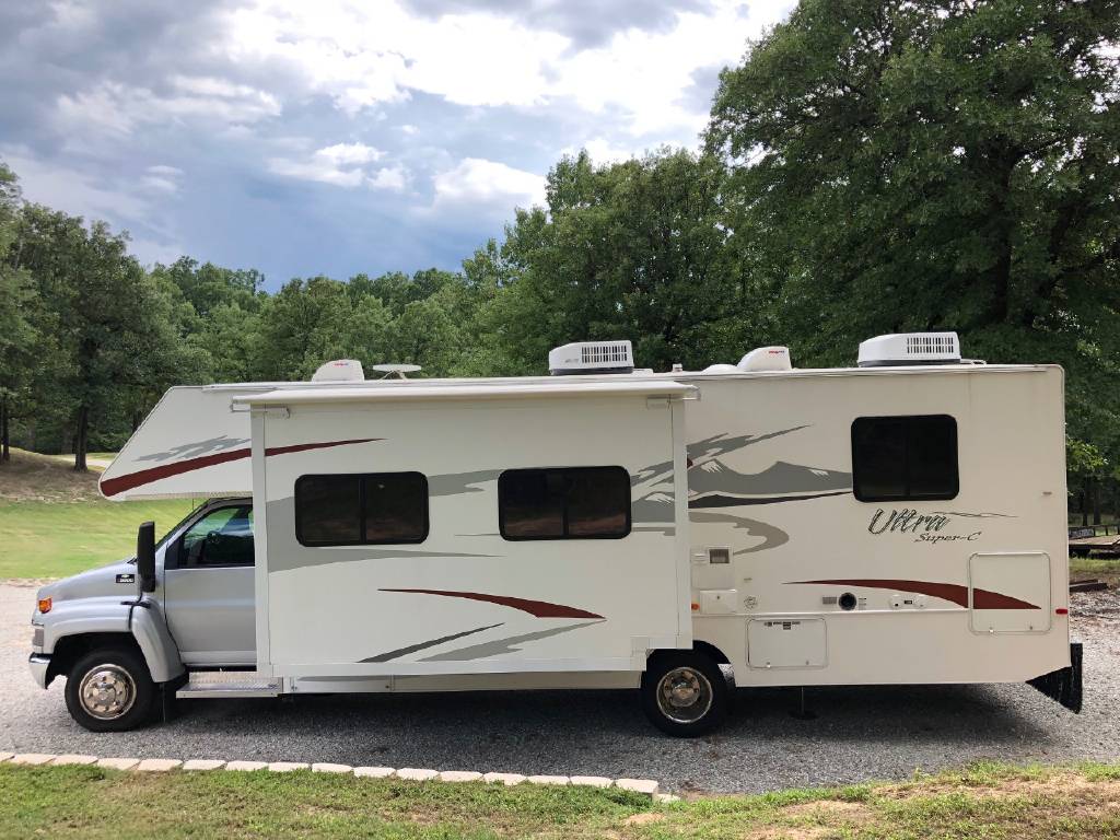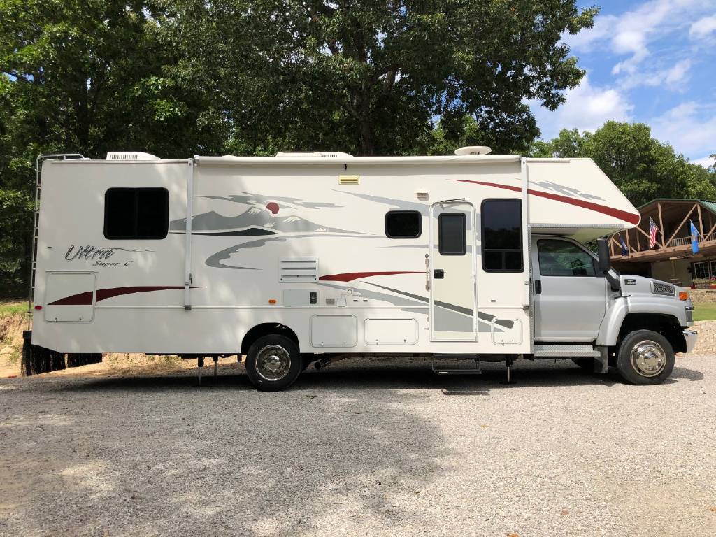 This Ultra Super C motorhome, by Gulf Stream, is in excellent condition and has a single super slide, queen bed in the rear with a wardrobe, custom dual leather recliners across from the swivel chair. Next to that is a 4 seat dinette. The overhead bunk area has a queen size sleep by number bed. The kitchen offers a stove, microwave with convection, refrigerator, and plenty of storage!