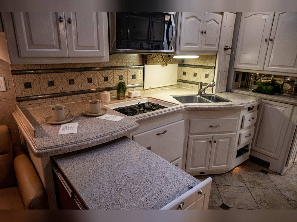 Tile kitchen backsplash Stainless steel 60/40 under-mount kit sinks Private commode room Co-Pilot Seat Power Footrest Ceramic Tile Floor Except Bed Room RS 78″ X 80″ California King Cross Island Bed RS Desk And Chair