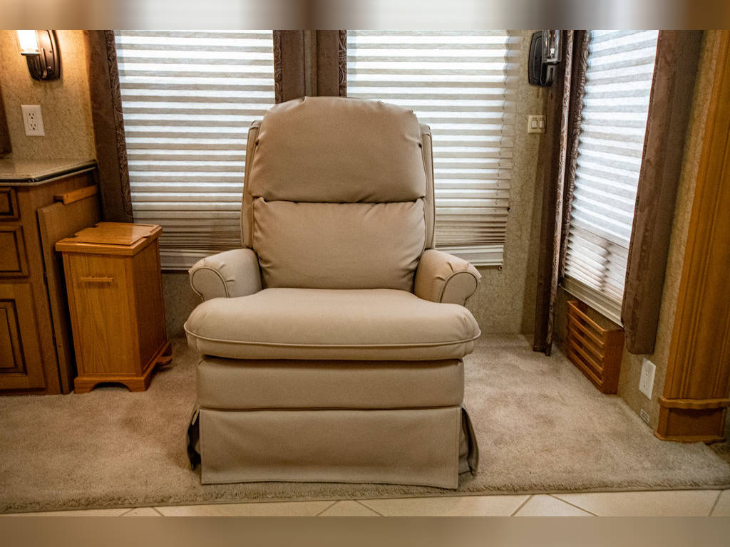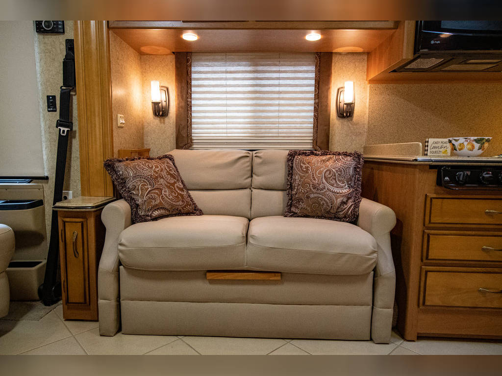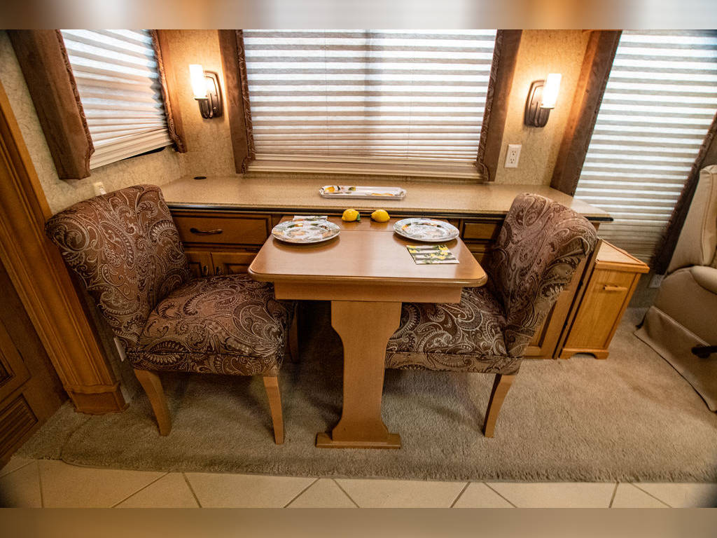 Powered Windshield Shades & Visors Six-Way Power Driver/Passenger Seats with Power Lumbar Support and Power Footrest Pleated Day/ Night Shades Throughout Coach CS Leather Jack-Knife Love Seat/Sleeper RS Dining Table & Chairs Ceramic Tile Floor Entry to Bed Room