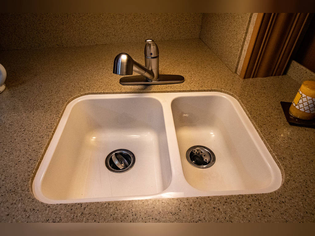 Polished Solid-Surface Countertop in Kitchen, Bathroom & Bedroom Molded 60-40 Corian Under-Mount Kitchen Sinks Solid Maple Cabinets RS Leather Recliner 2 Additional Folding Dining Chairs 60″ X 80″ Queen Cross Island Bed