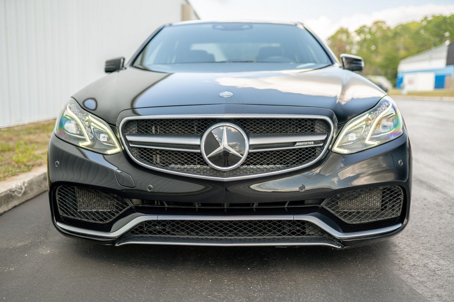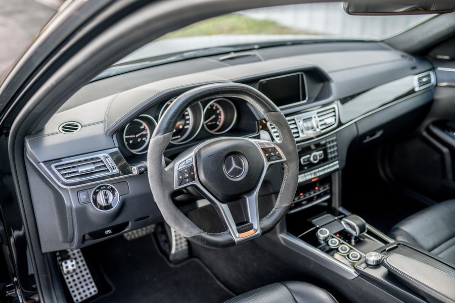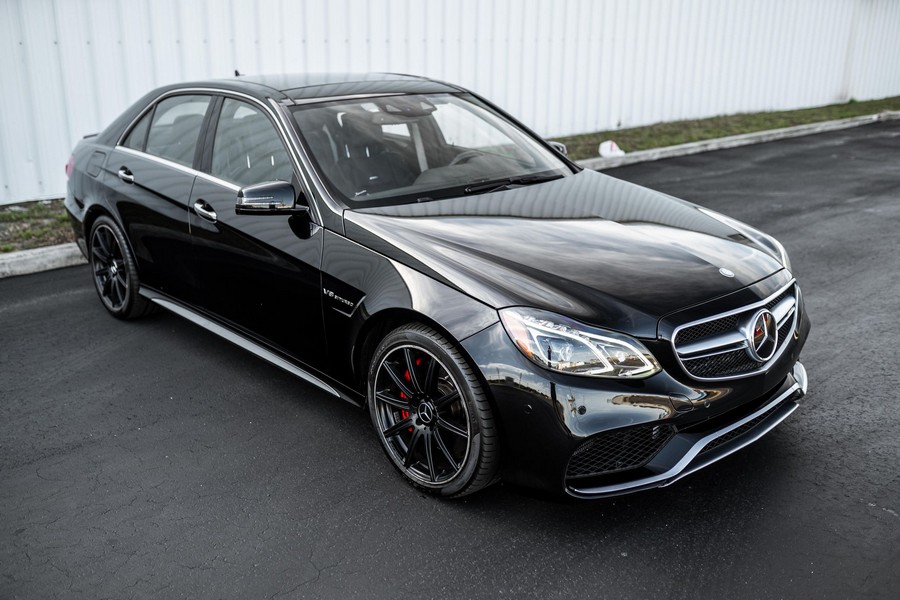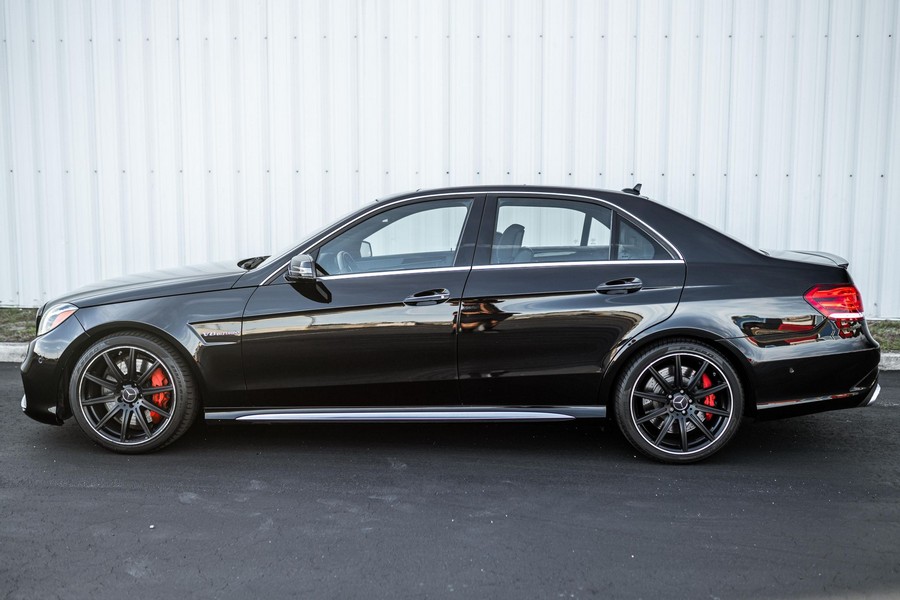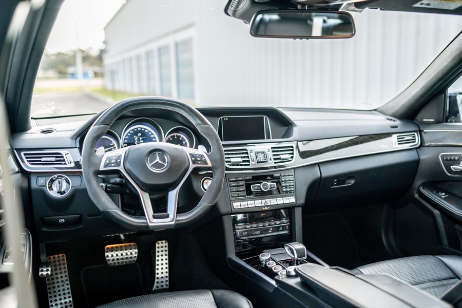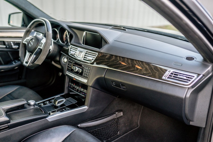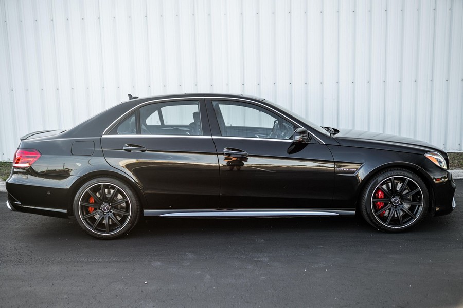 THIS… is a 2015 Mercedes-Benz E63 S AMG Sedan, finished in Obsidian Black with a black interior. The attached Carfax history report indicates no accidents or mileage discrepancies.Equipment includes the AMG Styling Package, 19-inch wheels, a limited-slip differential, LED headlights, panoramic sunroof, power-adjustable heated and ventilated front seats, AMG Performance steering wheel, Distronic Plus adaptive cruise control, a Harman/Kardon Logic7 Surround Sound system, and more as detailed below. The selling dealer reports no modifications. Power comes from an “M157” twin-turbocharged 5.5-liter V8, rated at 577 horsepower and 590 lb-ft of torque. Output is sent to all four wheels through a 7-speed automatic transmission and Mercedes-Benz’s 4Matic permanent all-wheel drive system.