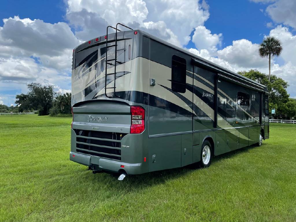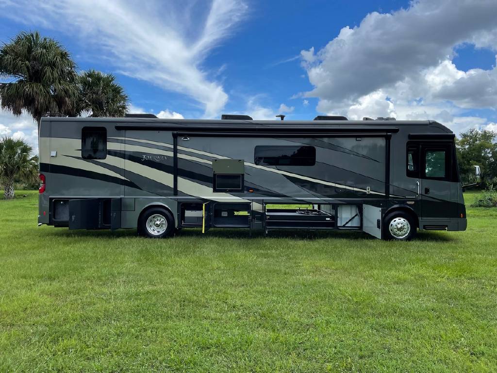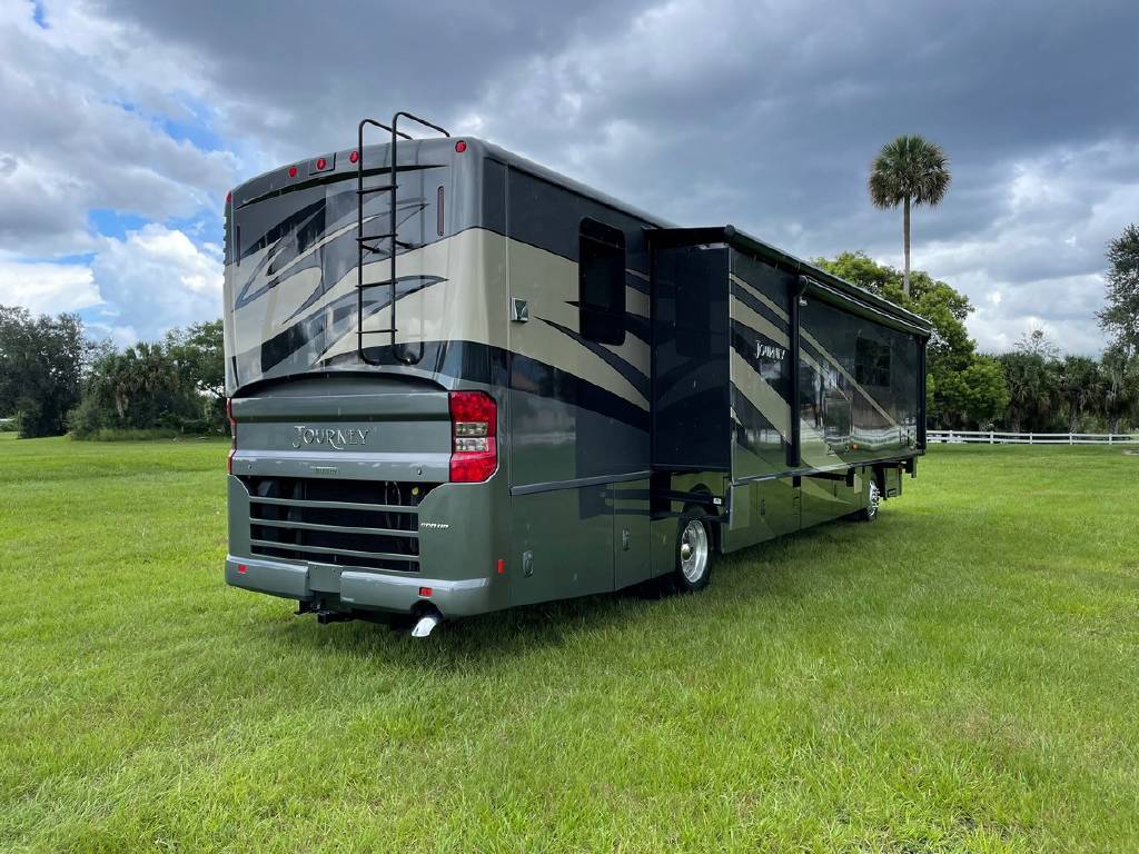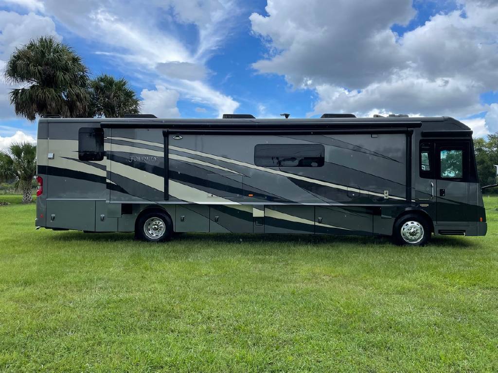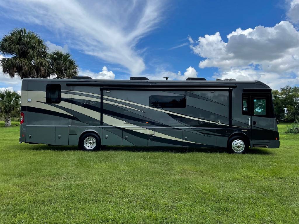 2016 Winnebago Journey 40R 3 slide motorhome with 53,223 miles. This couch is on a Maxum chassis powered by a 400-hp Cummins ISL 8.9L turbocharged diesel engine with Allison transmission. This coach has everything including Ultraleather ‘Rest Easy’ extendable sectional sofa, a massive HDTV with home theater soundbar, Glide & Dine dining table, fireplace, residential stainless steel French door refrigerator, microwave/convection oven, bath and a half, stackable washer/dryer, King size bed comfort control mattress, touch screen navigation and more!!!