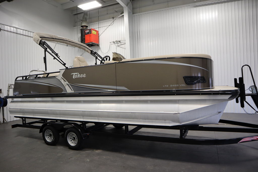 CLEAN 2019 TAHOE LTZ 2485 VRL PONTOON WITH TRAILER AND ONLY 29 ENGINE HOURS! A 115 hp Mercury Command Thrust 4-stroke EFI outboard powers this nicely equipped package.
