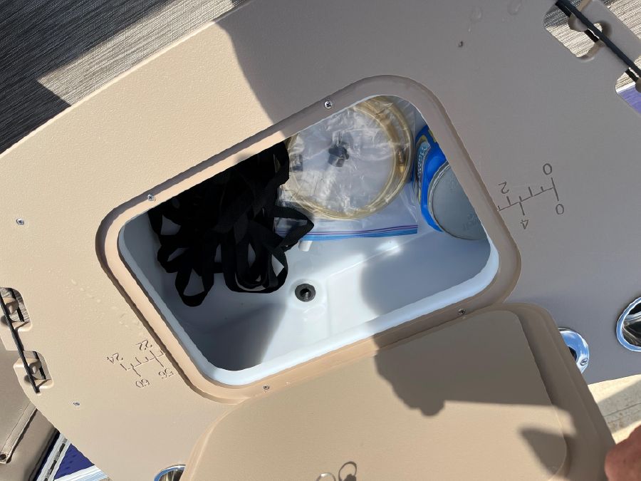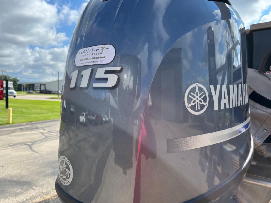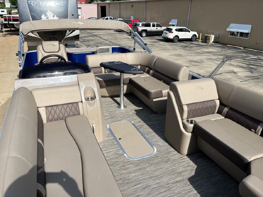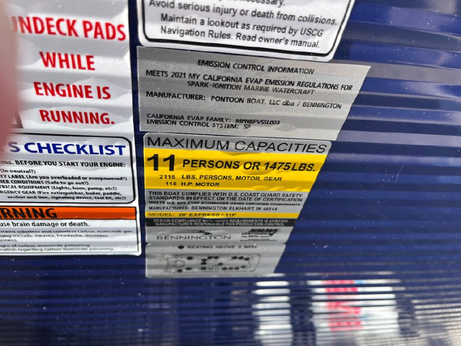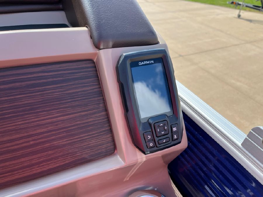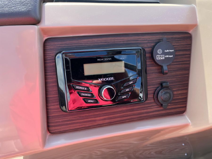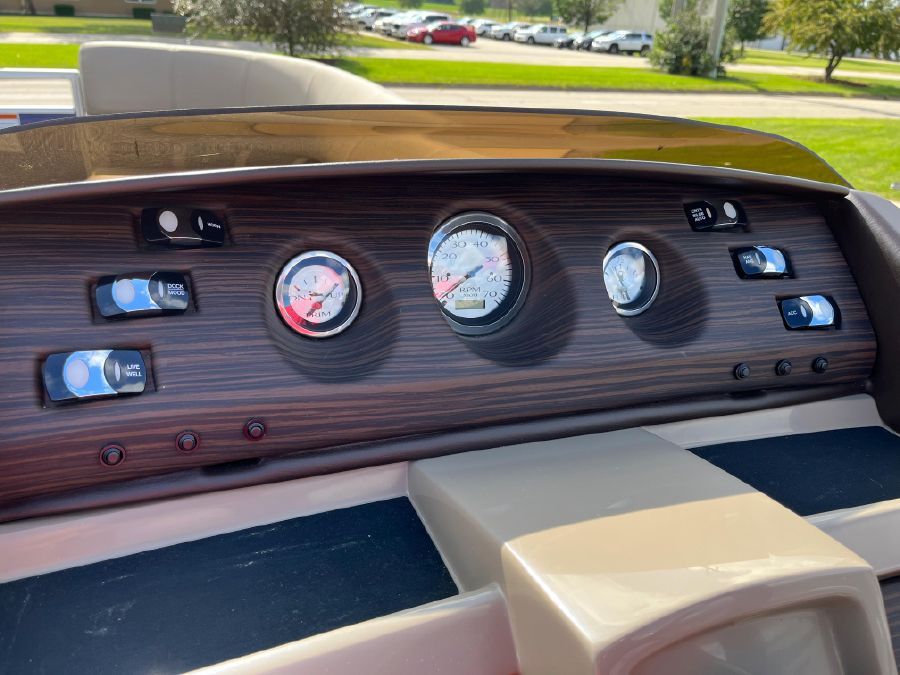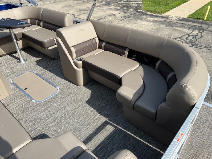 OPTIONS > Express Tri-Toon Pkg – Under Deck Wave Shield – Lifting Strakes – Splash Guards – Solid Keels – Extended Aft Decking – Docking Lights (LED) – SS Propeller – Full Vinyl Sea Grass Flooring – Accent Stripe – In Floor Storage Compartment – Diamond Pressed / Pillow Topped Interior (Simtex Vinyl) – 20% Cut Out Seating w/ Recessed Speakers / Cup Holders – Removable Cockpit Table – Raised Helm Station – Garmin Fish Finder (In Dash) – Tilt Steering System – Upgraded Recliner Seat – Aft Fishing Station (2 Fish Seats w/ Center Fish Galley / Live Well / Rod Holders – Full Cover (Clip On) – Kicker Upgraded Bluetooth Stereo System – Mood Lighting – Large Bimini Top w/ Multiple Positions