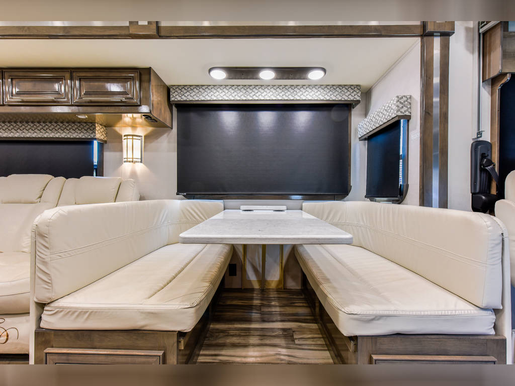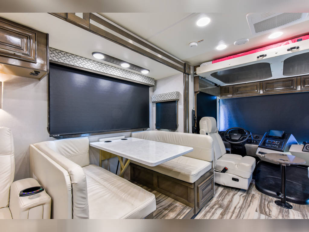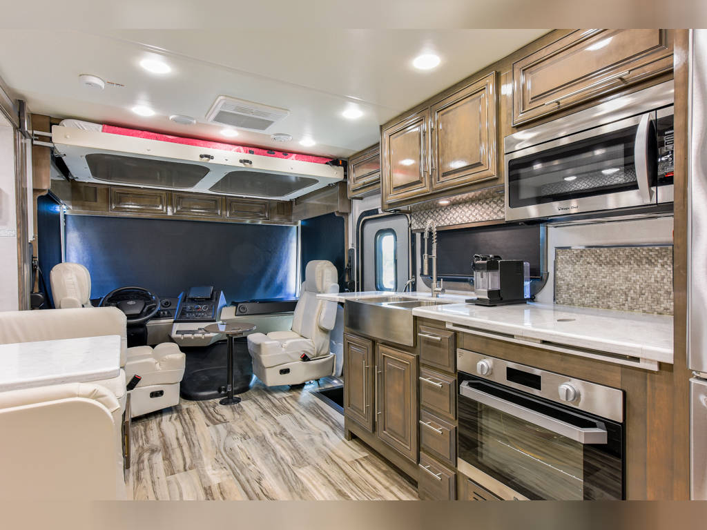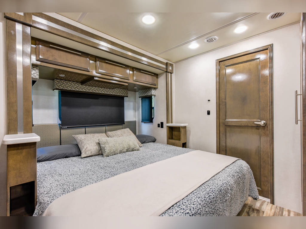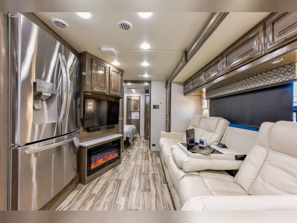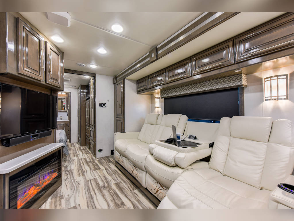 Other amazing amenities include: Solid Surface Dream Dinette Table Top. Storage Under Dinette Booth. Wrap Around Dinette Seat Cushion’s. 2 Seat Belts in Dinette/ Couch/ Theater Seats. Thomas Payne 4 Person Couch w/Pop-up 110v Outlets & USBs, Recline, Adjustable Head Rests, Heat, and Massage. Wood Trim around Windows. Night Shades Throughout. Day Shades Throughout. 40″ LED Main TV. 5K BTU Fireplace. Over Head Cabinets above Theater Seats / Couch w/ USB’s and LED Lighting. Solid Surface Kitchen Countertops. Brush Nickel Designer Faucet w/ Pull out Spray Wond. Under Mount Farm Style Kitchen Sink. Kitchen Sink Covers. Recessed 3 Burner LP Cooktop with Solid Surface Covers. Stainless Steel Convection Microwave. Decorative Tile Backsplash. Stainless Steel 23 Cubic Foot 3 Door Refrigerator w/ Water and Ice in Door. Stainless Steel w/ Glass Door 22 Cubic Inches LP Oven. Full Extension Ball Bearing Drawer Guides w/ Soft Close. Raised Panel Maple Cabinetry. Wood Trim around Kitchen Window Kitchen. Pantry Pull Out Drawers w/Soft Close Guides. Fantastic Fan 32″. LED Bedroom TV w/Flip Up. Stackable Washer and Dryer. King Bed (72″ x 80″) Designer Bedspread w/ Accent Pillows Tilt-a-View Bed w/7″ Memory Foam Mattress. Solid Surface Night Stands w/USB’s and 110 Outlets. CPAP Prep. Solid Surface Counter. Tops Porcelain Macerating Toilet Mid-Ship Half / Full Bath. One Piece Fiberglass Shower w/ Seat Frosted Glass Shower Door. Dual Sink 50 AMP Service. Auto Transfer Switch. 7000 Watt Onan Generator. 4 House Batteries. Precision Plex Operation System w/ Mobile App. Auto Generator Start Voltage / HVAC. 2,000 Watt Magnum Pure Sine Wave Inverter / Converter. Dimmable LED Lighting Throught out. 18,000 Equivalent BTU Front A/C w/ Heat Pump. 18,000 Equivalent BTU Rear A/C w Heat Pump. 35,000 BTU Furnace Artic Package w/ Heat Tape in Wet Bay Forced Air Heat for Holding Tanks. 10 Gallon Hot Water Heater. House Battery Disconnect Switch. 24.5 Gallon LP Tank. External LP Quick Connect. Black Tank Flush. Water Filtration System. Outside Shower. 115 Watt Solar Panel w/ Controller. Full Body Paint. Outside Entertainment Center w/ 40″ LED TV. Ford Chassis warranty transfers.