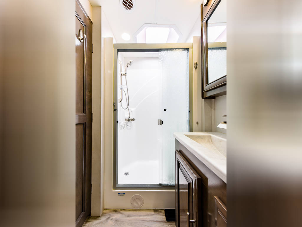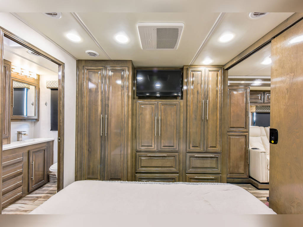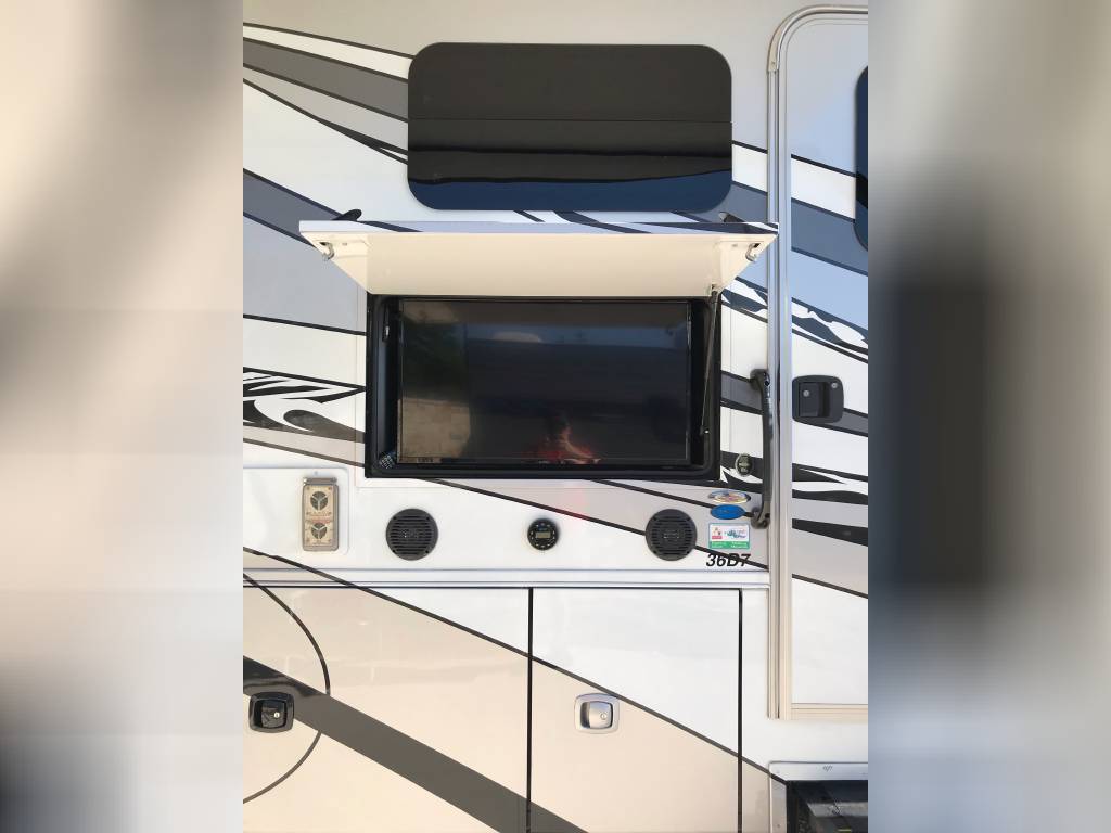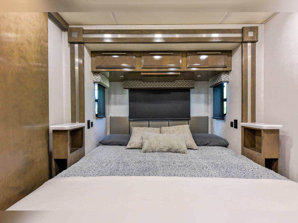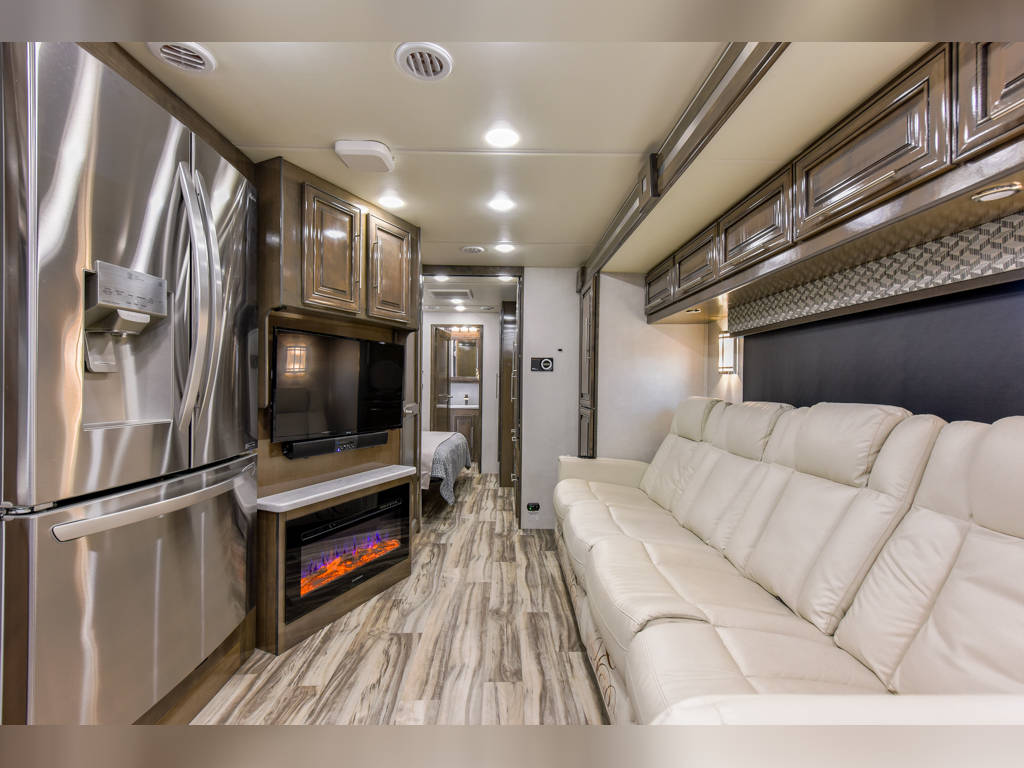 Other amazing amenities include: Solid Surface Dream Dinette Table Top. Storage Under Dinette Booth. Wrap Around Dinette Seat Cushion’s. 2 Seat Belts in Dinette/ Couch/ Theater Seats. Thomas Payne 4 Person Couch w/Pop-up 110v Outlets & USBs, Recline, Adjustable Head Rests, Heat, and Massage. Wood Trim around Windows. Night Shades Throughout. Day Shades Throughout. 40″ LED Main TV. 5K BTU Fireplace. Over Head Cabinets above Theater Seats / Couch w/ USB’s and LED Lighting. Solid Surface Kitchen Countertops. Brush Nickel Designer Faucet w/ Pull out Spray Wond. Under Mount Farm Style Kitchen Sink. Kitchen Sink Covers. Recessed 3 Burner LP Cooktop with Solid Surface Covers. Stainless Steel Convection Microwave. Decorative Tile Backsplash. Stainless Steel 23 Cubic Foot 3 Door Refrigerator w/ Water and Ice in Door. Stainless Steel w/ Glass Door 22 Cubic Inches LP Oven. Full Extension Ball Bearing Drawer Guides w/ Soft Close. Raised Panel Maple Cabinetry. Wood Trim around Kitchen Window Kitchen. Pantry Pull Out Drawers w/Soft Close Guides. Fantastic Fan 32″. LED Bedroom TV w/Flip Up. Stackable Washer and Dryer. King Bed (72″ x 80″) Designer Bedspread w/ Accent Pillows Tilt-a-View Bed w/7″ Memory Foam Mattress. Solid Surface Night Stands w/USB’s and 110 Outlets. CPAP Prep. Solid Surface Counter. Tops Porcelain Macerating Toilet Mid-Ship Half / Full Bath. One Piece Fiberglass Shower w/ Seat Frosted Glass Shower Door. Dual Sink 50 AMP Service. Auto Transfer Switch. 7000 Watt Onan Generator. 4 House Batteries. Precision Plex Operation System w/ Mobile App. Auto Generator Start Voltage / HVAC. 2,000 Watt Magnum Pure Sine Wave Inverter / Converter. Dimmable LED Lighting Throught out. 18,000 Equivalent BTU Front A/C w/ Heat Pump. 18,000 Equivalent BTU Rear A/C w Heat Pump. 35,000 BTU Furnace Artic Package w/ Heat Tape in Wet Bay Forced Air Heat for Holding Tanks. 10 Gallon Hot Water Heater. House Battery Disconnect Switch. 24.5 Gallon LP Tank. External LP Quick Connect. Black Tank Flush. Water Filtration System. Outside Shower. 115 Watt Solar Panel w/ Controller. Full Body Paint. Outside Entertainment Center w/ 40″ LED TV. Ford Chassis warranty transfers.