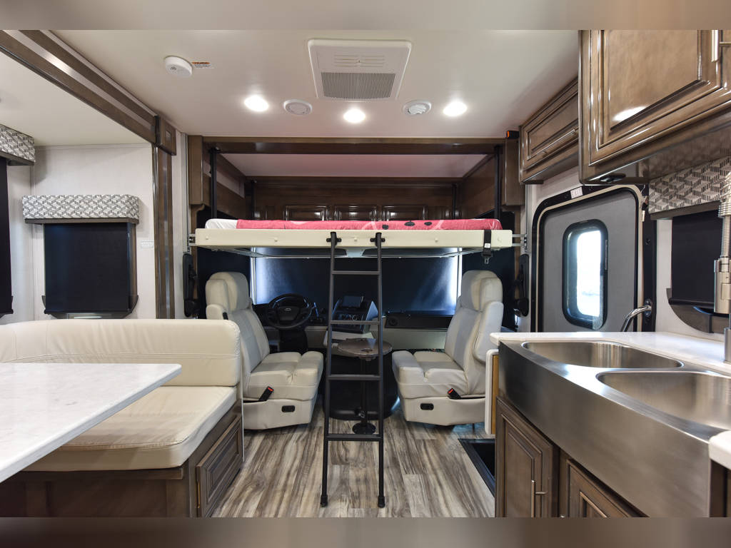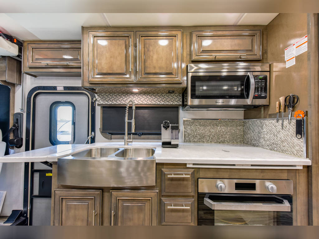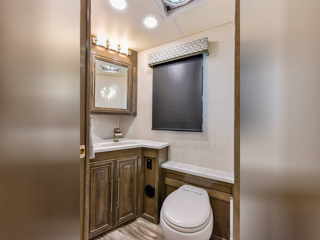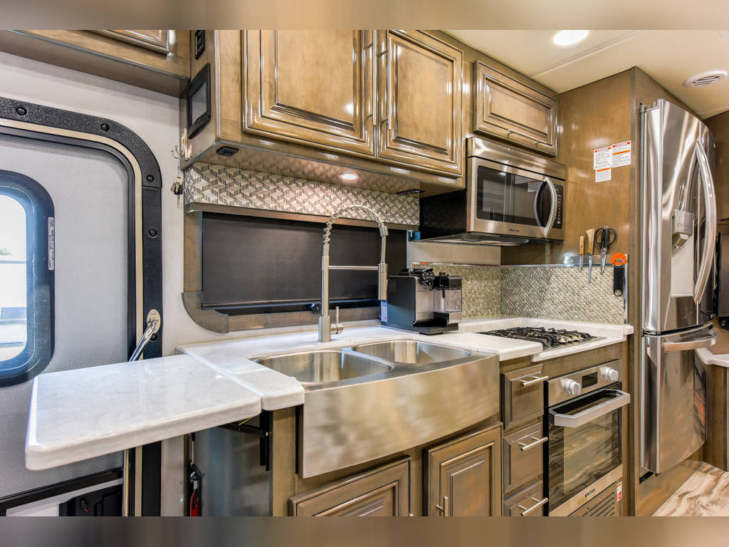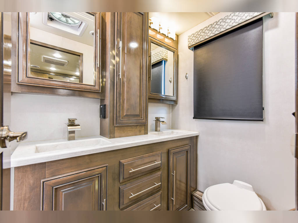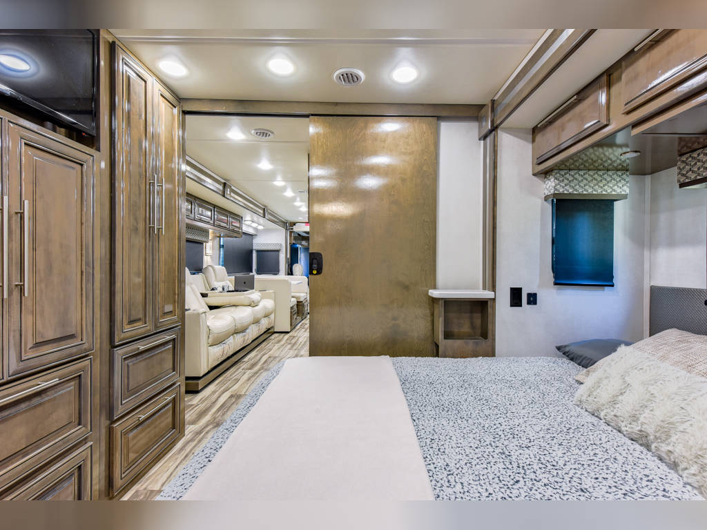 Other amazing amenities include: Solid Surface Dream Dinette Table Top. Storage Under Dinette Booth. Wrap Around Dinette Seat Cushion’s. 2 Seat Belts in Dinette/ Couch/ Theater Seats. Thomas Payne 4 Person Couch w/Pop-up 110v Outlets & USBs, Recline, Adjustable Head Rests, Heat, and Massage. Wood Trim around Windows. Night Shades Throughout. Day Shades Throughout. 40″ LED Main TV. 5K BTU Fireplace. Over Head Cabinets above Theater Seats / Couch w/ USB’s and LED Lighting. Solid Surface Kitchen Countertops. Brush Nickel Designer Faucet w/ Pull out Spray Wond. Under Mount Farm Style Kitchen Sink. Kitchen Sink Covers. Recessed 3 Burner LP Cooktop with Solid Surface Covers. Stainless Steel Convection Microwave. Decorative Tile Backsplash. Stainless Steel 23 Cubic Foot 3 Door Refrigerator w/ Water and Ice in Door. Stainless Steel w/ Glass Door 22 Cubic Inches LP Oven. Full Extension Ball Bearing Drawer Guides w/ Soft Close. Raised Panel Maple Cabinetry. Wood Trim around Kitchen Window Kitchen. Pantry Pull Out Drawers w/Soft Close Guides. Fantastic Fan 32″. LED Bedroom TV w/Flip Up. Stackable Washer and Dryer. King Bed (72″ x 80″) Designer Bedspread w/ Accent Pillows Tilt-a-View Bed w/7″ Memory Foam Mattress. Solid Surface Night Stands w/USB’s and 110 Outlets. CPAP Prep. Solid Surface Counter. Tops Porcelain Macerating Toilet Mid-Ship Half / Full Bath. One Piece Fiberglass Shower w/ Seat Frosted Glass Shower Door. Dual Sink 50 AMP Service. Auto Transfer Switch. 7000 Watt Onan Generator. 4 House Batteries. Precision Plex Operation System w/ Mobile App. Auto Generator Start Voltage / HVAC. 2,000 Watt Magnum Pure Sine Wave Inverter / Converter. Dimmable LED Lighting Throught out. 18,000 Equivalent BTU Front A/C w/ Heat Pump. 18,000 Equivalent BTU Rear A/C w Heat Pump. 35,000 BTU Furnace Artic Package w/ Heat Tape in Wet Bay Forced Air Heat for Holding Tanks. 10 Gallon Hot Water Heater. House Battery Disconnect Switch. 24.5 Gallon LP Tank. External LP Quick Connect. Black Tank Flush. Water Filtration System. Outside Shower. 115 Watt Solar Panel w/ Controller. Full Body Paint. Outside Entertainment Center w/ 40″ LED TV. Ford Chassis warranty transfers.