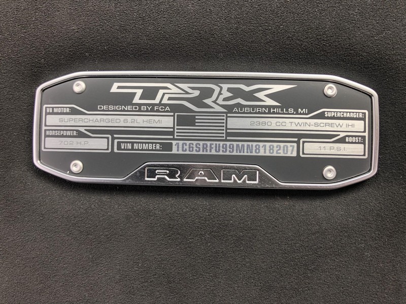 The attached Carfax vehicle history report shows no accidents in this Ram’s past. According to the window sticker provided in the gallery, factory equipment includes the Technology, Advanced Safety, and TRX Level 2 Equipment groups, the TRX Carbon-Fiber Package, 18-inch wheels, high-performance brakes, adaptive damping, a RamBar, rock rails, a dual-pane panoramic sunroof, leather upholstery, a Uconnect 12-inch infotainment system, and a Harman Kardon 19-speaker audio system. The seller reports no modifications. Power comes from a supercharged 6.2-liter “Hellcat” Hemi V8, rated at 702 horsepower and 650 lb-ft of torque. Output is sent to all four wheels via an 8-speed automatic transmission.